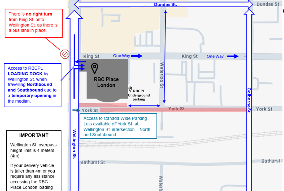 Props can be loaded into RBC Place via the loading dock on Wellington St. Look for a sign on the white building that says RBC Place London Service Entrance. You can only access the entrance when you are travelling NORTH on Wellington. If you are going south on Wellington, you cannot turn left into the Service Entrance due to an island in the middle of the street.